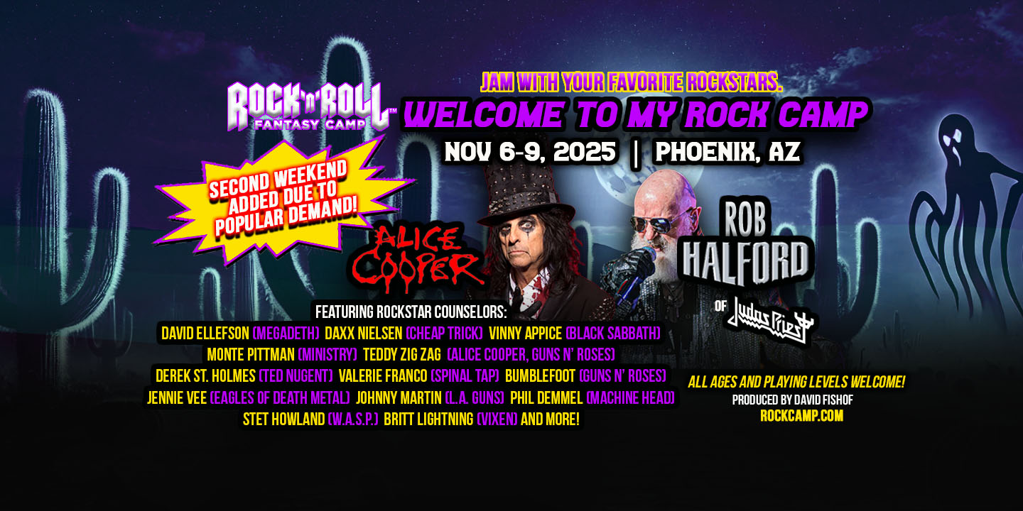 Due to popular demand, a second weekend of this camp has been added! After melting faces across the country on their epic fall tour, Alice Cooper and Rob Halford of Judas Priest are inviting musicians and vocalists of all ages and skill levels to do more than just watch from the audience. This November, Rock ‘n’ Roll Fantasy Camp heads to Phoenix, Arizona for four unforgettable days of music, mentorship, and live performances—headlined by two of rock’s most iconic legends: Alice Cooper and Rob Halford of Judas Priest.